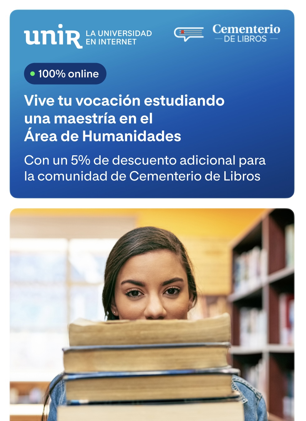 En Cementerio de Libros siempre hemos creído que la literatura no es un camino solitario. Leer, escribir y pensar el mundo a través de los libros cobra más sentido cuando se hace en comunidad, cuando se tienden puentes y se suman voluntades. Por eso hoy queremos compartir una noticia que nos llena de alegría y orgullo: hemos firmado un convenio con la Universidad Internacional de La Rioja (UNIR).